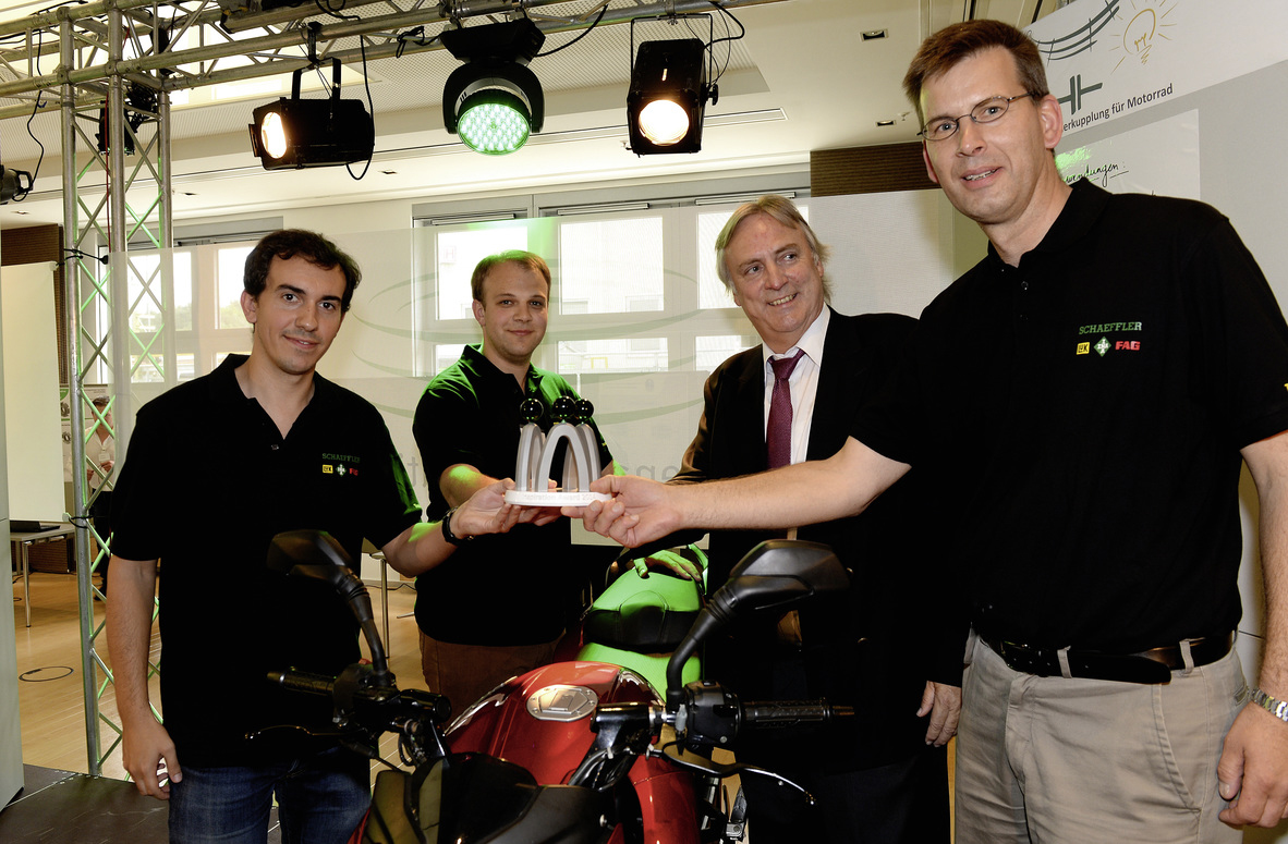 從左至右:來(lái)自布爾的馬丁查姆布倫(MartinChambrion)和詹斯蘭格齊(JensLanganki)憑借關(guān)于摩托車(chē)新離合器的創(chuàng )意獲得了今年的靈感大獎。舍弗勒集團副首席執行官兼首席技術(shù)官彼得古茲默教授和離合器壓盤(pán)產(chǎn)品開(kāi)發(fā)總監克里斯托弗惠特曼為其頒獎。