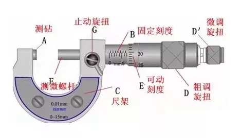 2)左手持尺架(C),右手轉動(dòng)粗調旋鈕D使測桿F與測砧A間距稍大于被測物,放入被測物,轉動(dòng)保護旋鈕D′到夾住被測物,直到棘輪發(fā)出聲音為止,撥動(dòng)固定旋鈕G使測桿固定后讀數。